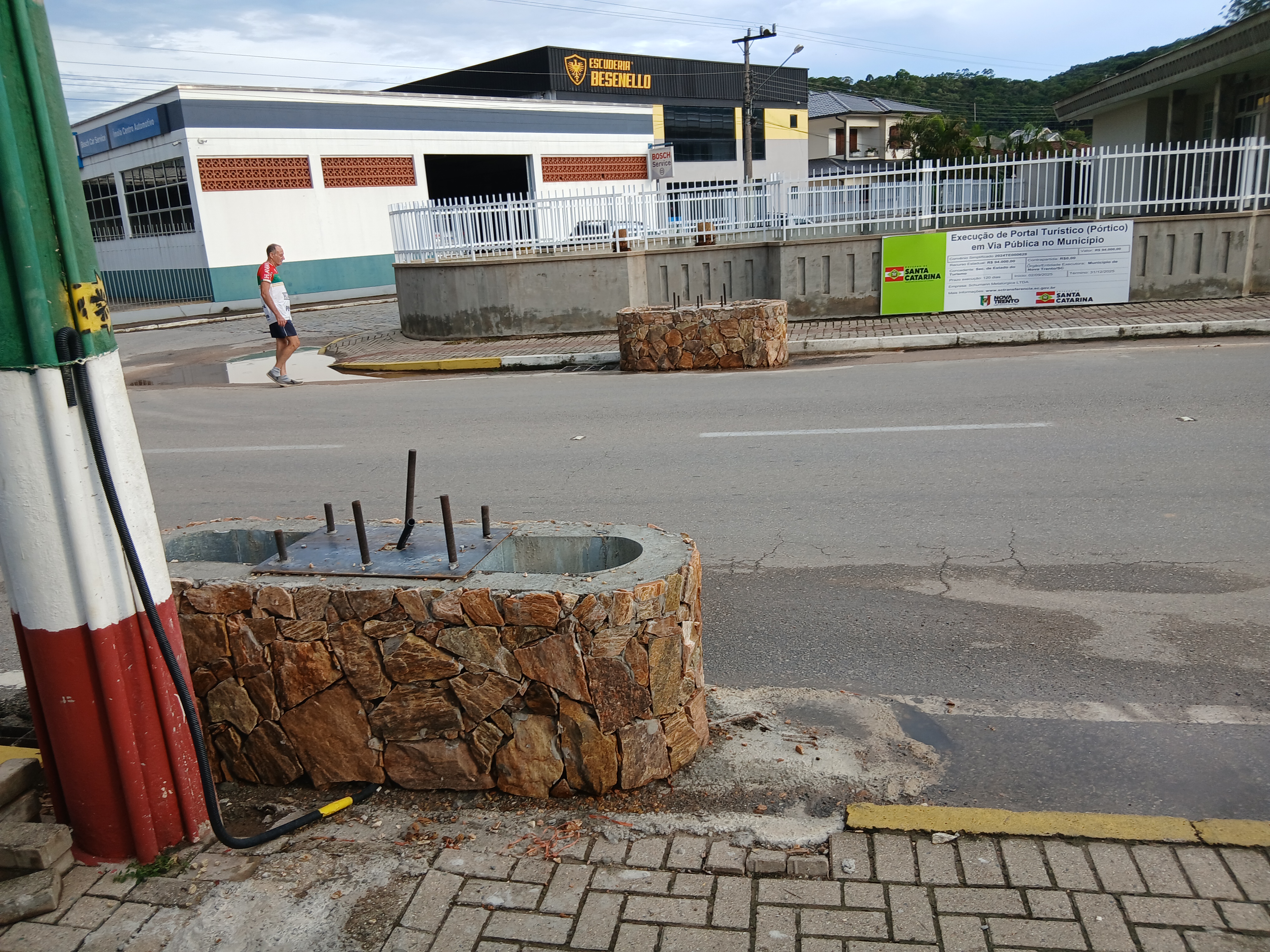 Estão prontas desde semana passada as duas sapatas (foto), em cimento armado e revestidas com placas de pedra sabão, na Rua Santo Inácio, onde será assentada a estrutura, em aço, do mais novo pórtico turístico de Nova Trento. A empresa vencedora da licitação, a Schumann Metalúrgica Ltda, de Timbó, está na fase final de produção da estrutura, conforme modelo da foto.