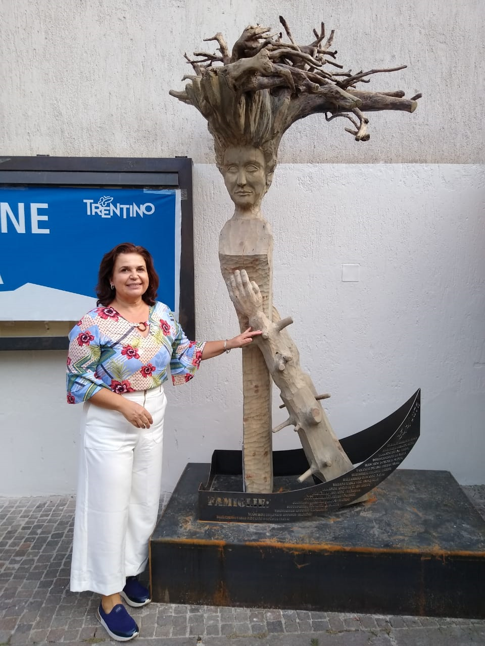 Na base, de metal, da estátua, estão escritos os nomes das familias que de lá partiram no dia 25 de setembro de 1875, para o Brasil e com paradeiro final em Nova Trento. Dentre eles, além de Amabile Wisentainer e seus pais, o trisavô da “madrinha” Valdirene Dalla Brida.