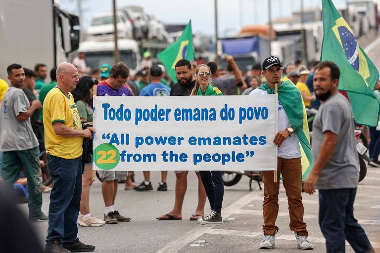 Caminhoneiros simpatizantes de Bolsonaro que bloquearam trecho da BR 101 em Palhoça, na região metropolitana de Florianópolis, apareceram nos principais noticiários das TVs da Europa nas últimas horas. Certamente porque se fizeram entender com frase bilíngue numa imensa faixa em português e inglês: “Todo poder emana do povo” (“All power emanates from the people”).