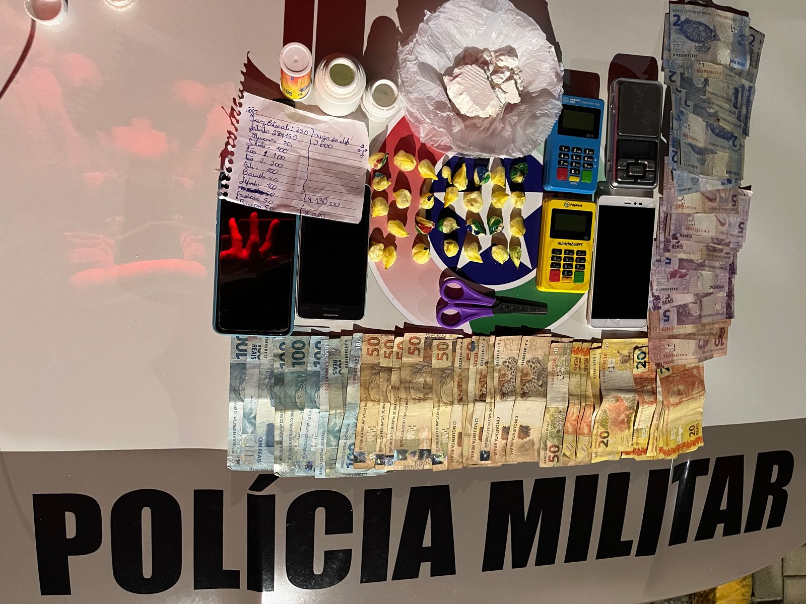 Na busca pessoal e veicular foi encontrado no bolso da bermuda do homem uma bucha da mesma droga, além de R$ 408 em espécie e dois celulares. Com a mulher foram encontrados R$ 1.177 e um celular. A guarnição deslocou até a residência dela, pois a mesma informou que teria mais drogas. No armário da cozinha guardava 41,4 gramas de droga semelhante a cocaína, uma balança de precisão e embalagens plásticas para embalagem. Num quarto, um pote plástico continha 22 buchas de droga semelhante a cocaína, uma tesoura, um papel com anotações do tráfico e duas máquinas de cartão de crédito.