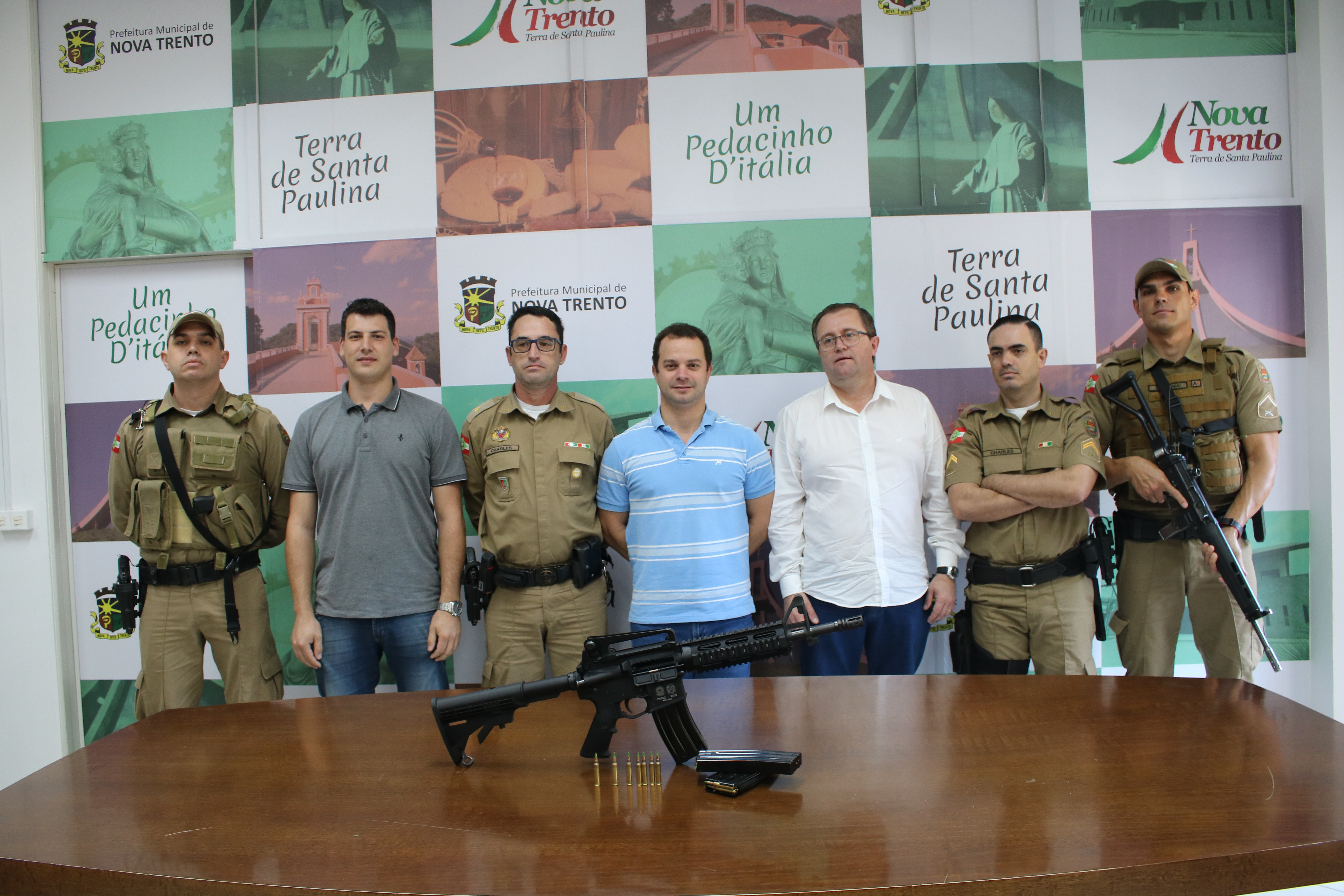 A partir de uma doação em dinheiro da Associação dos Moradores do Besenello, no valor de R$ 5 mil, a qual se juntou uma colaboração da Policia Militar do Estado, de R$ 4.100, a Policia Militar de Nova Trento acaba de receber um fuzil T4/556, da Taurus.