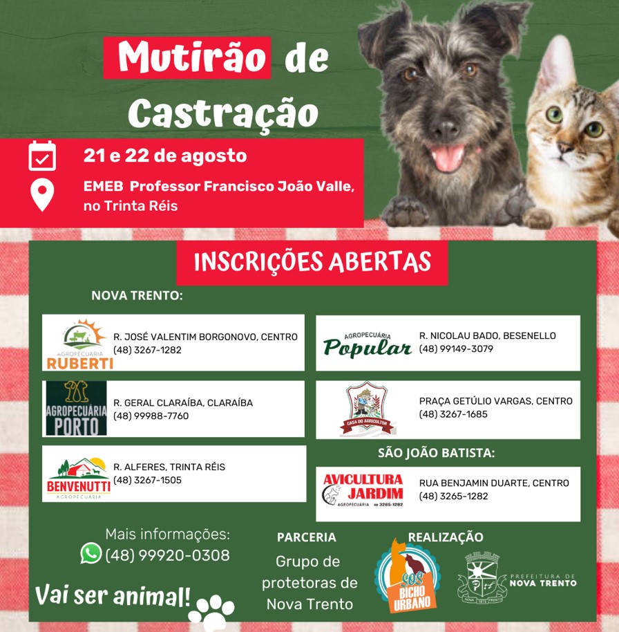 As inscriçoes estão sendo recebidos nas lojas agropecuárias Ruberti, Popular, Benvenutti e Porto. A iniciativa é uma realização do Instituto Bicho Urbano e Prefeitura Municipal, com apoio do Grupo de Protetoras de Animais de Nova Trento. Mais informações pelo telefone e whatsapp (48) 99920-0308.